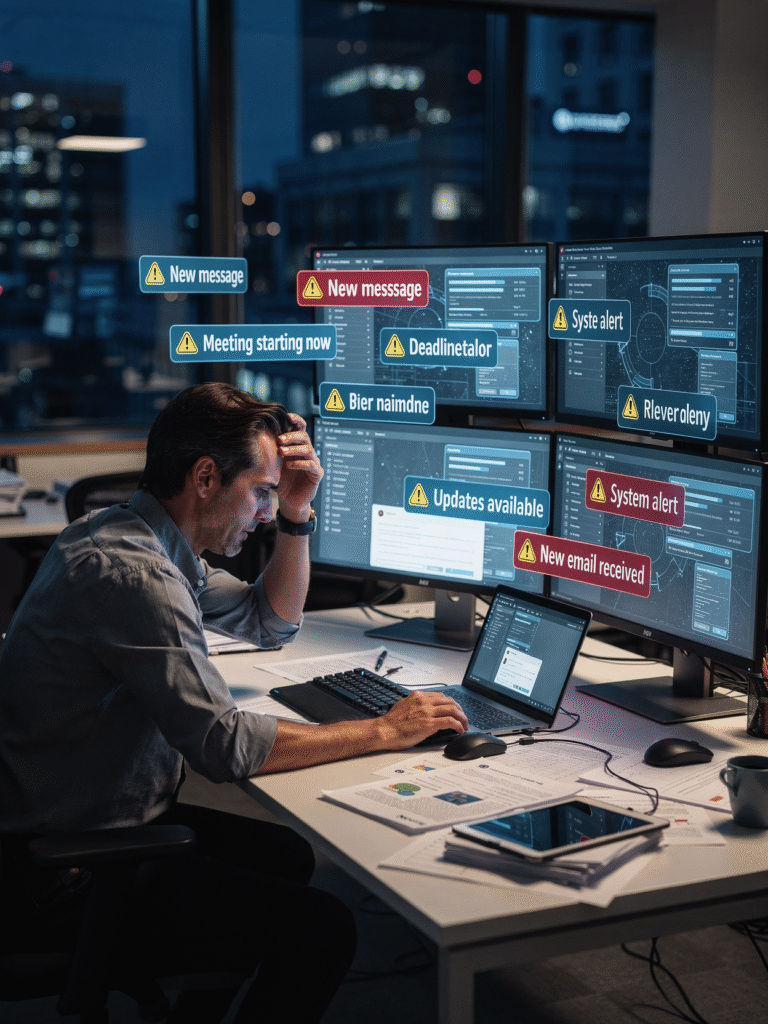 Research shows task switching costs $450 billion annually in lost productivity. The average office worker switches tasks more than 300 times per day.